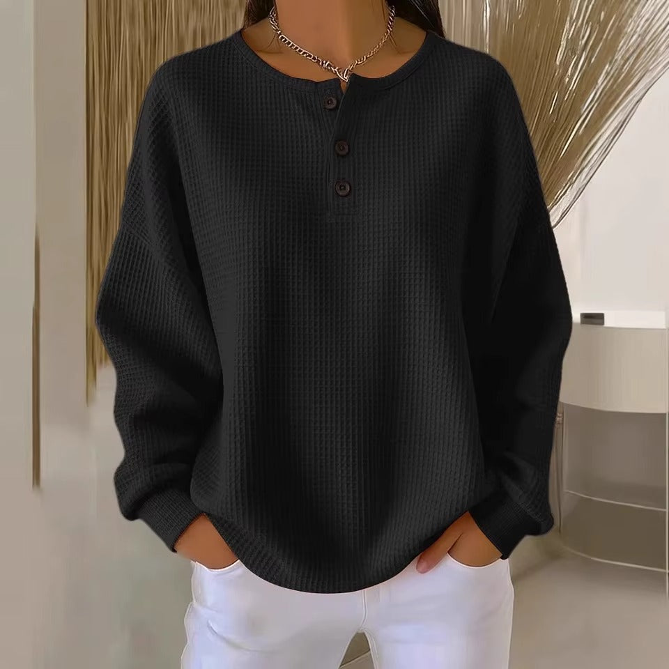Il maglione è un modello Henley e presenta tre bottoni funzionali al centro dello scollo.